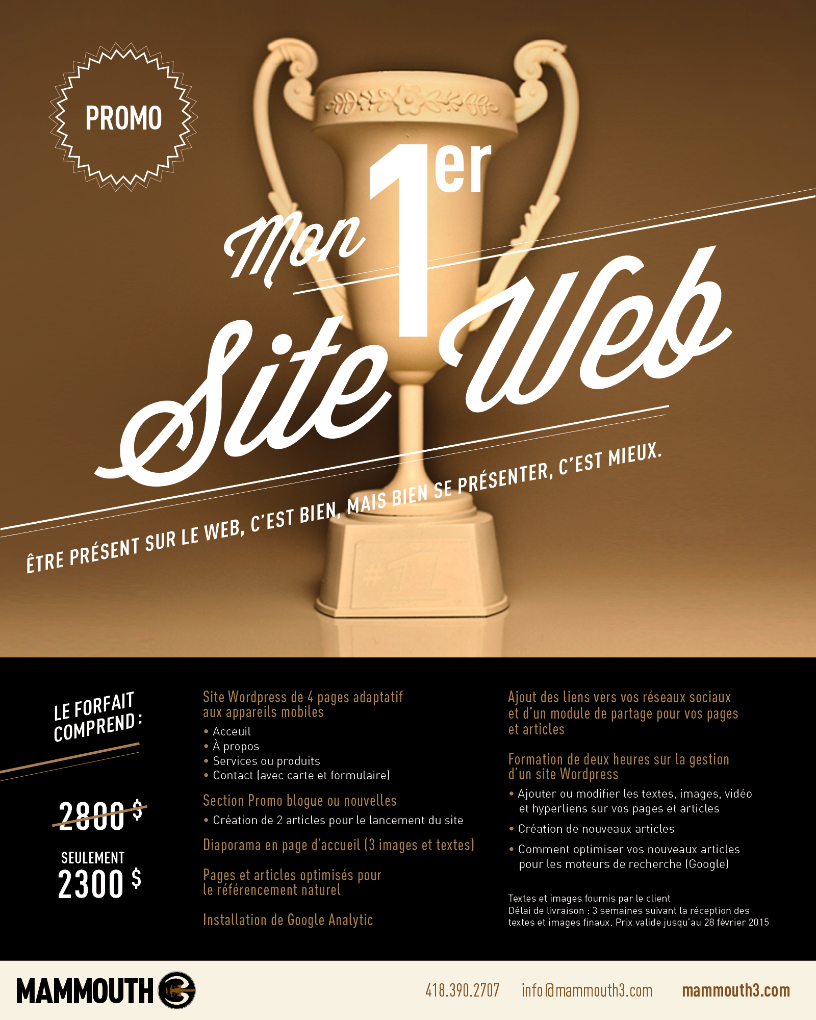 Après les fêtes, c’est le temps des rabais un peu partout, et c’est aussi le cas chez nos fiers amis de Mammouth 3 qui offrent un rabais sur la production de site WordPress. J’ai donc conçu un visuel on ne peut plus promo, ayant pour base une autre magnifique photo d’Alain Dignard, une des 2 moitiés dudit mammouth.