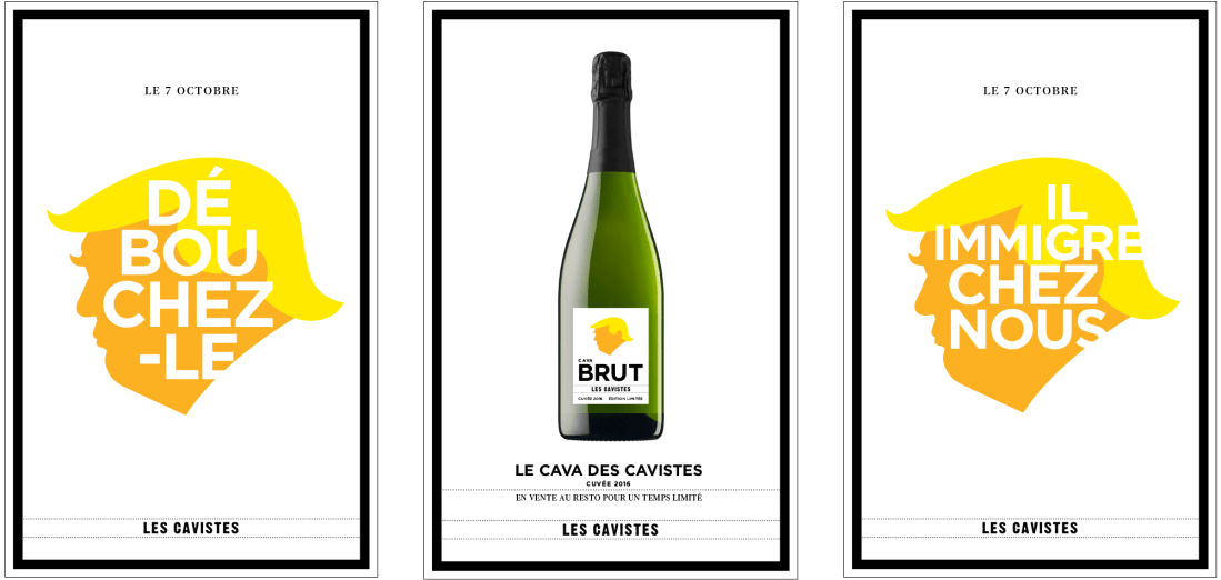 Pour la mise en vente de leur premier vin à l’automne 2016, Maude et Robert du restaurant Les Cavistes nous ont approchés pour créer le nom du vin, le design de l’étiquette, et la campagne de promotion. Le Cava Brut étant un vin pétillant facile à boire, ils souhaitaient un branding simple qui ferait sourire, tout en soulignant un événement cocasse de l’actualité: la candidature de Trump aux présidentielles américaines.