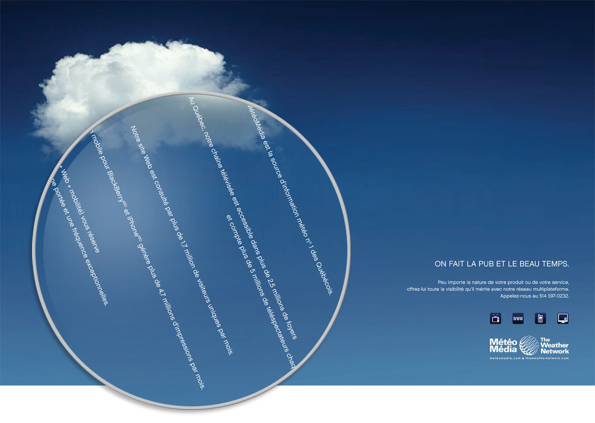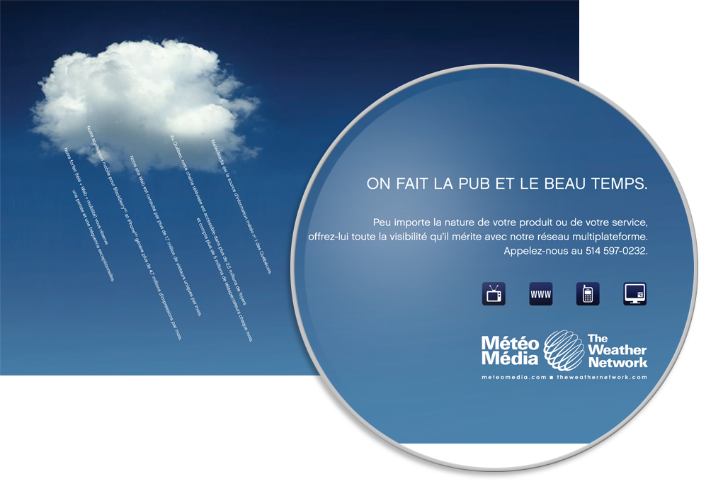 Double page dans les magazines de l’industrie des communications faisant la promotion des bénéfices et opportunités d’acheter du placement média sur les chaînes de télévision The Weather Network et MétéoMédia.